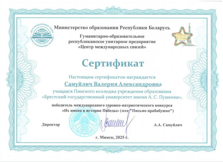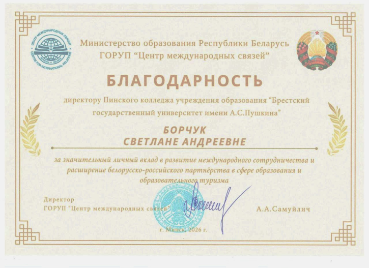 6 февраля 2026 года Борчук Светлана Андреевна, директор Пинского колледжа учреждения образования «Брестский государственный университет имени А.С.Пушкина», была удостоена Благодарности Министерства образования Республики Беларусь за значительный вклад в развитие международного сотрудничества и расширение белорусско-российского партнерства в сфере образования. Награду вручил директор ГОРУП «Центр международных связей» Министерства образования Республики Беларусь Самуйлич Александр Александрович.